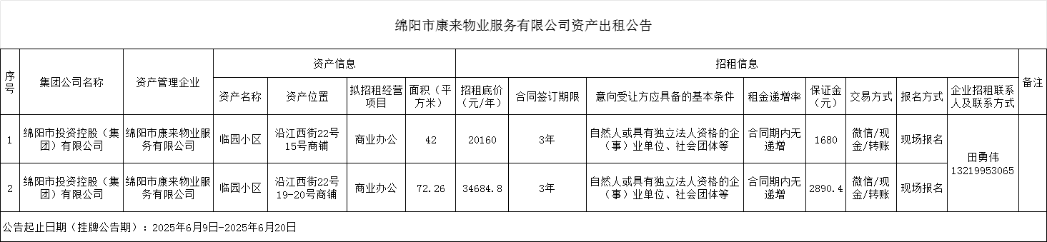 綿陽(yáng)市康來物業(yè)服務(wù)有限公司資產(chǎn)出租公告