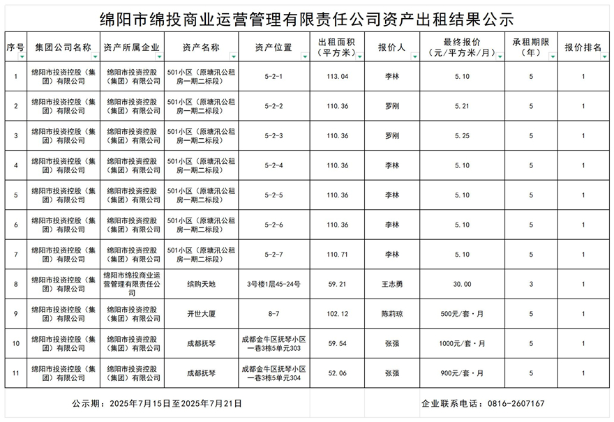 綿陽市綿投商業(yè)運營管理有限責任公司資產(chǎn)出租結(jié)果公示