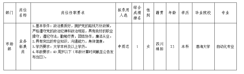 根據(jù)綿陽市建設(shè)工程質(zhì)量檢測(cè)中心有限責(zé)任公司發(fā)布的招聘公告及招聘相關(guān)規(guī)定,經(jīng)筆試、面試、背景調(diào)查、體檢等程序,擬錄用申雨芯同志到綿陽市建設(shè)工程質(zhì)量檢測(cè)中心有限責(zé)任公司工作,現(xiàn)予以公示,具體情況如下: