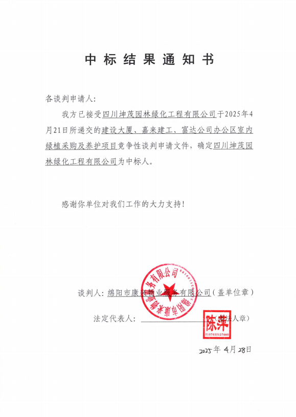 建設(shè)大廈、嘉來建工、富達公司辦公區(qū)室內(nèi)綠植采購及養(yǎng)護項目中標(biāo)結(jié)果通知