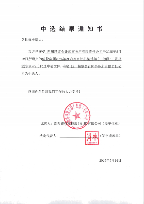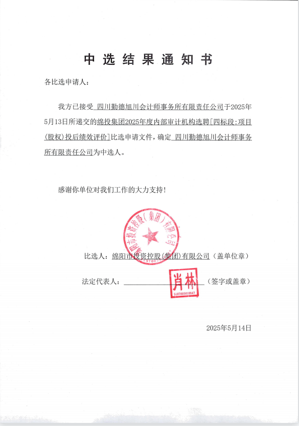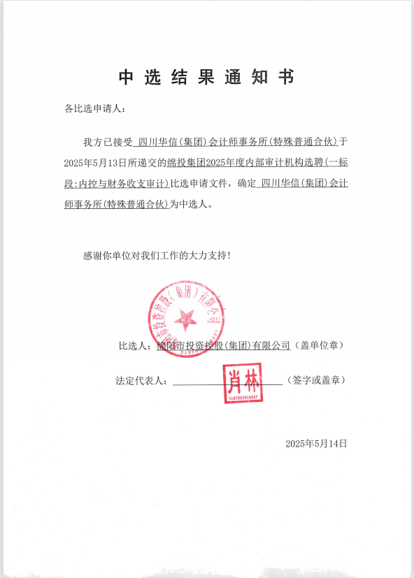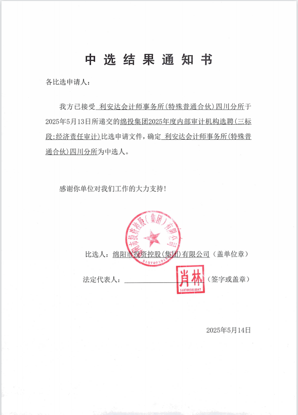 綿投集團(tuán)2025年度內(nèi)部審計(jì)機(jī)構(gòu)選聘中選結(jié)果通知書(shū)